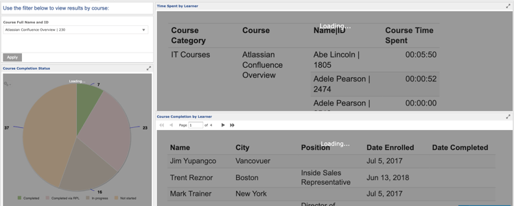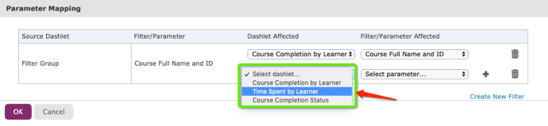 Dashboards are made up of a collection of dashlets or reports, and to successfully integrate these reports, make sure that the filters you want to use across each report in your dashboard match. For example, if you want to filter your reports by course, then you need to ensure that each report has the exactly the same filter.