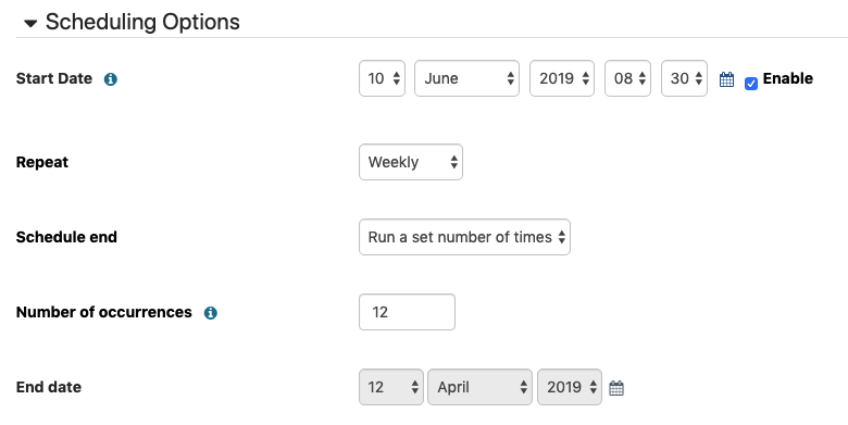 Say you have a 12-week long course and you’d like to share a progress report on activity completion with the facilitator every Monday morning while the course runs. You can set up the date of the first report to be sent (the Monday after the course starts), get the report to run weekly, and set the occurrences to 12.