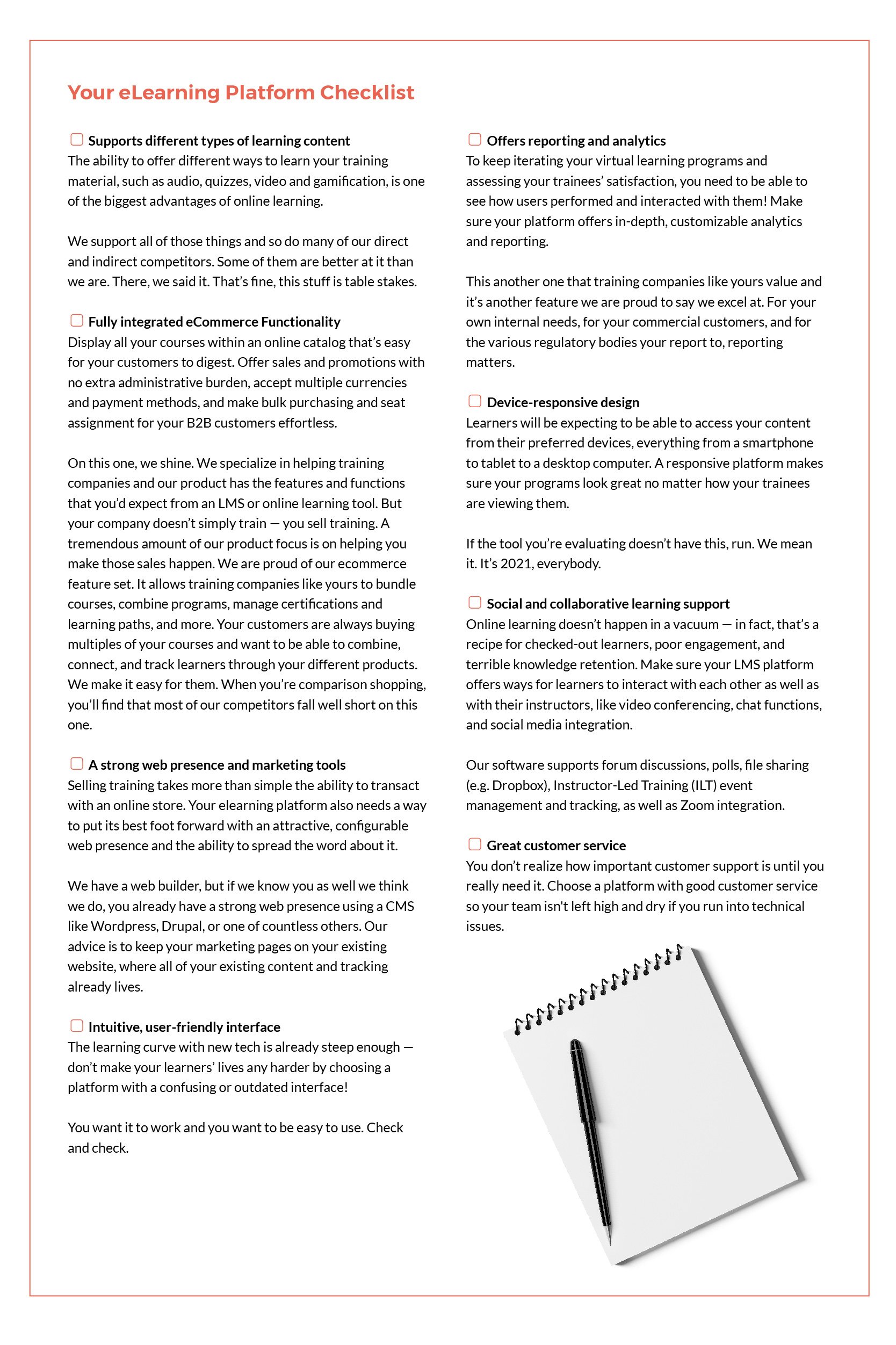 It’s time for us to address the elephant in the room — our bias. Earlier in this section we teased the third step by saying it was to begin comparison shopping for solution partners. In the spirit of full transparency, even that sentence is designed to frame this conversation in our favour. We are, after all, not simply an eLearning tool but a platform designed to help training companies market, sell, manage, and measure their training products online. We could have said “comparison shopping for learning tools,” but we opted to use “solution partners” to get you thinking about this project holistically.